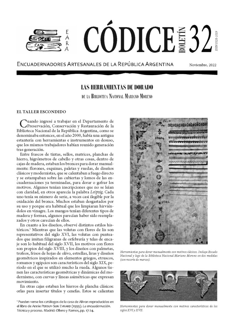 Las herramientas de dorado de la Biblioteca Nacional Mariano Moreno / Vanesa Muzzopappa Editorial / María Angela Silvetti La experiencia